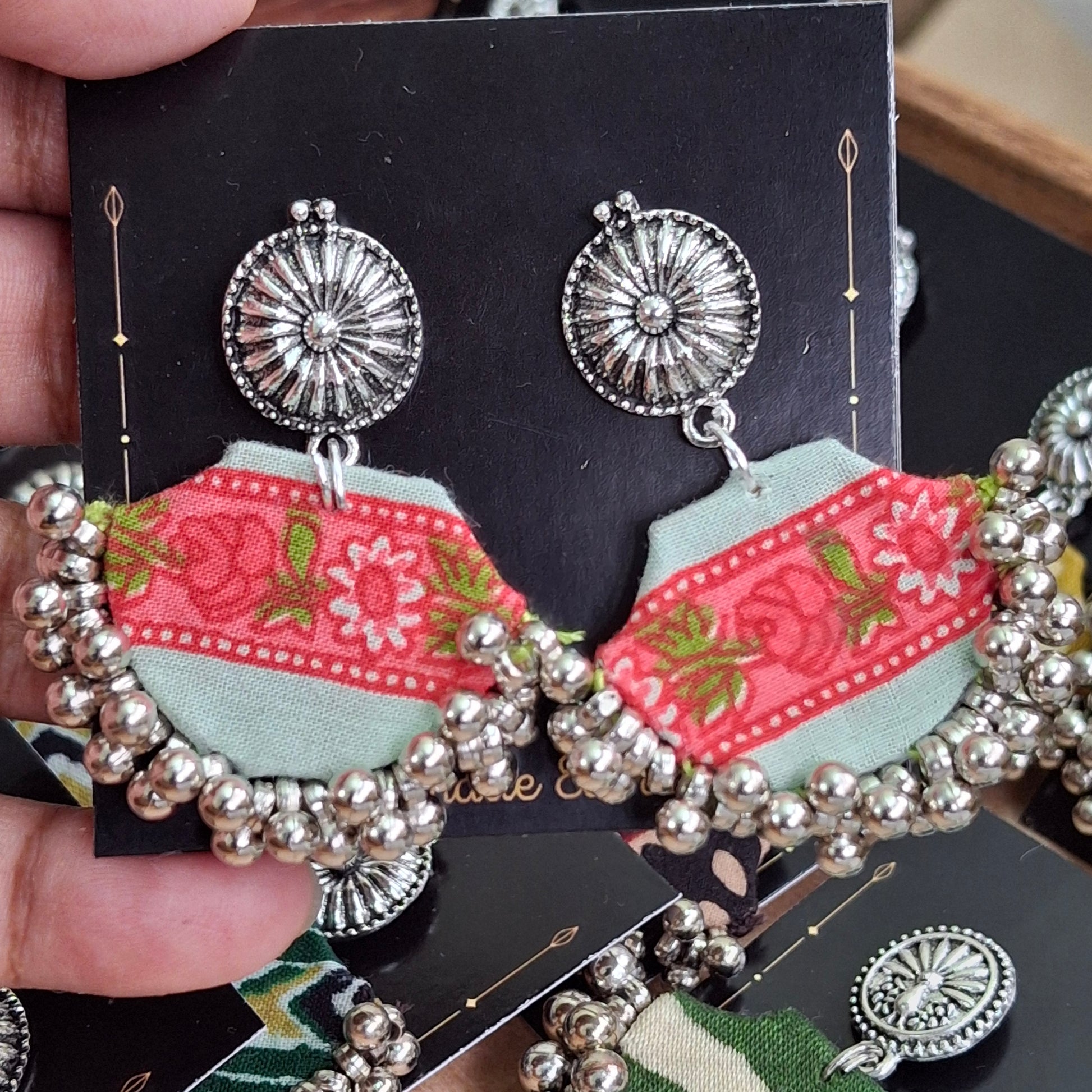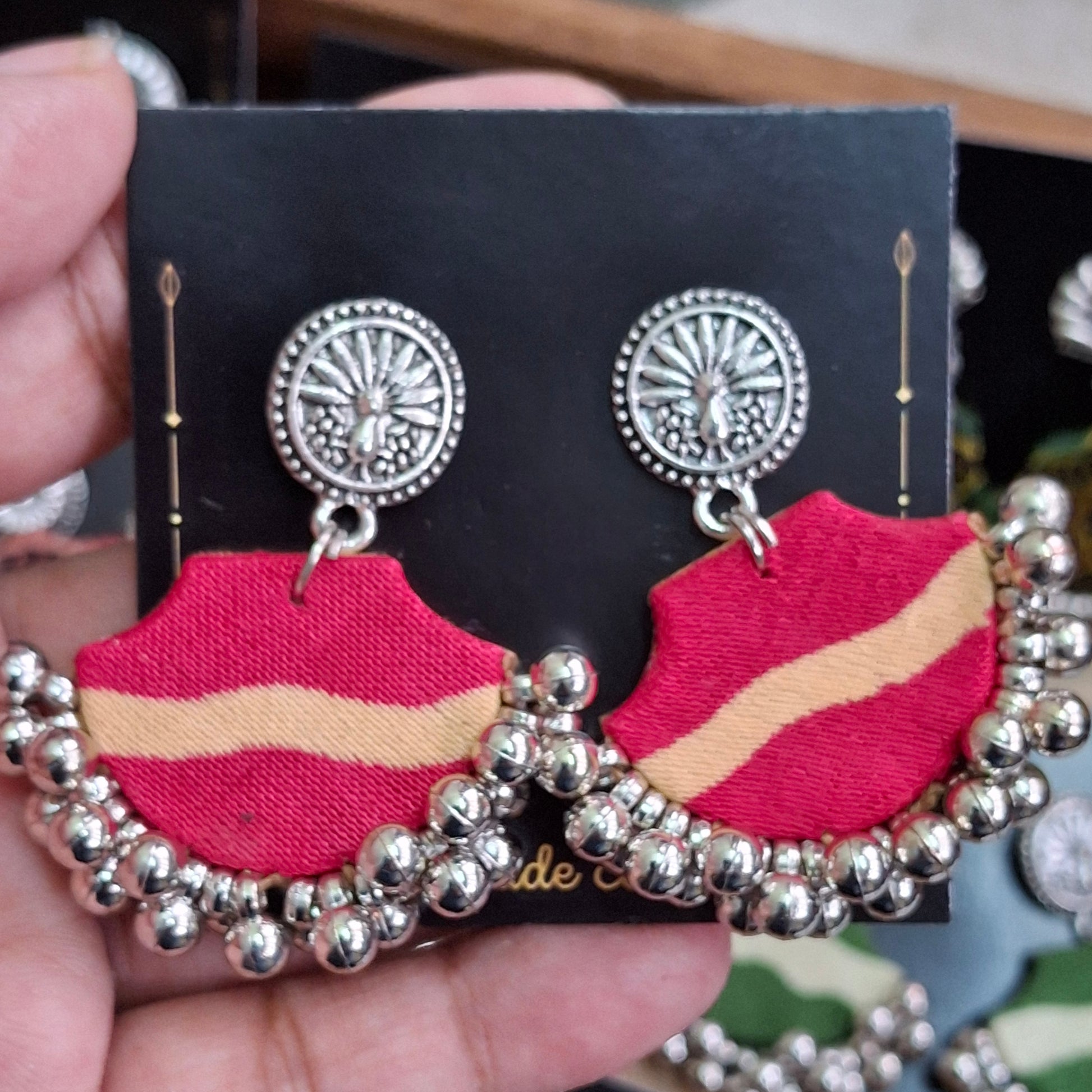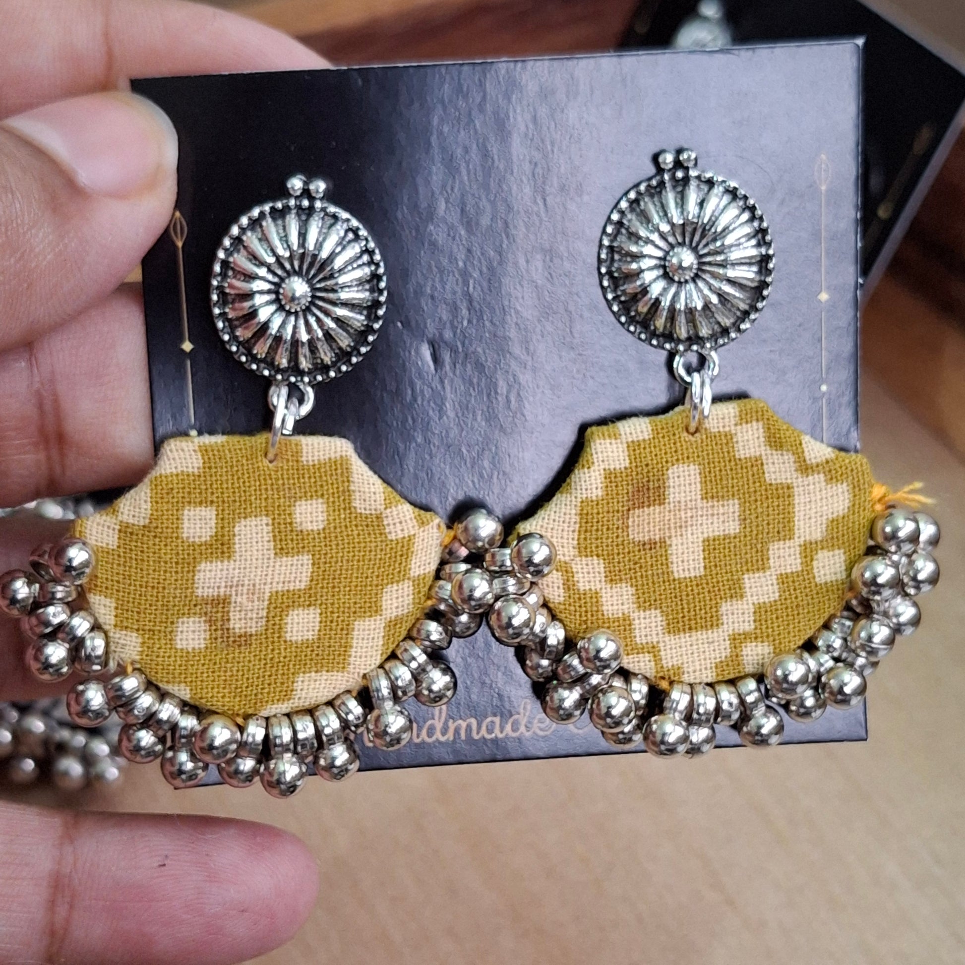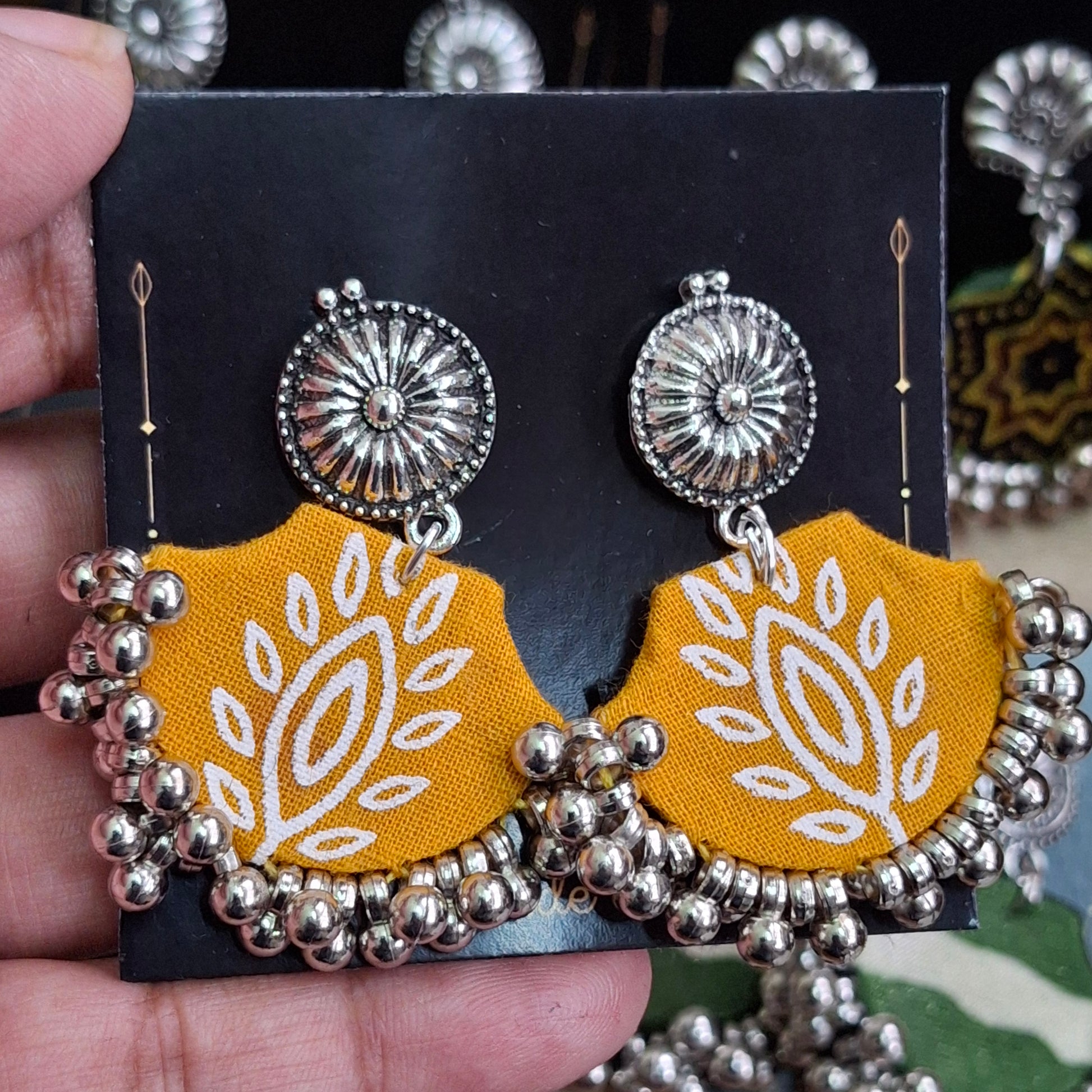 When you want to style but not heavy, these light fabric earrings are perfect. You can style these with our Ajrakh Mashru Silk Tote Bags to complete the look.