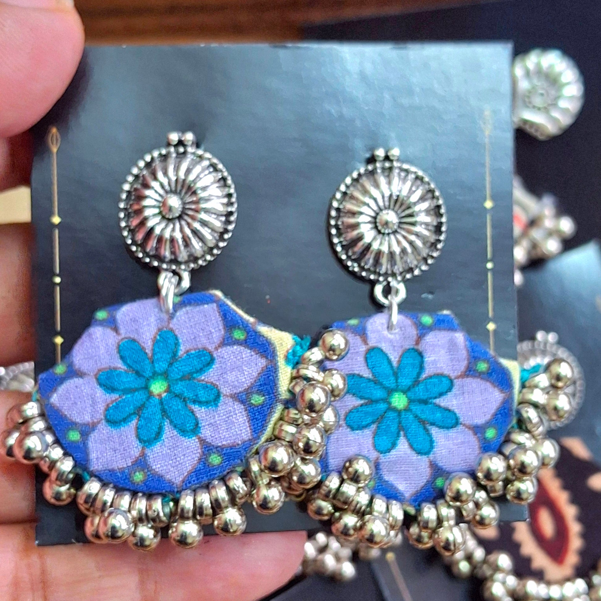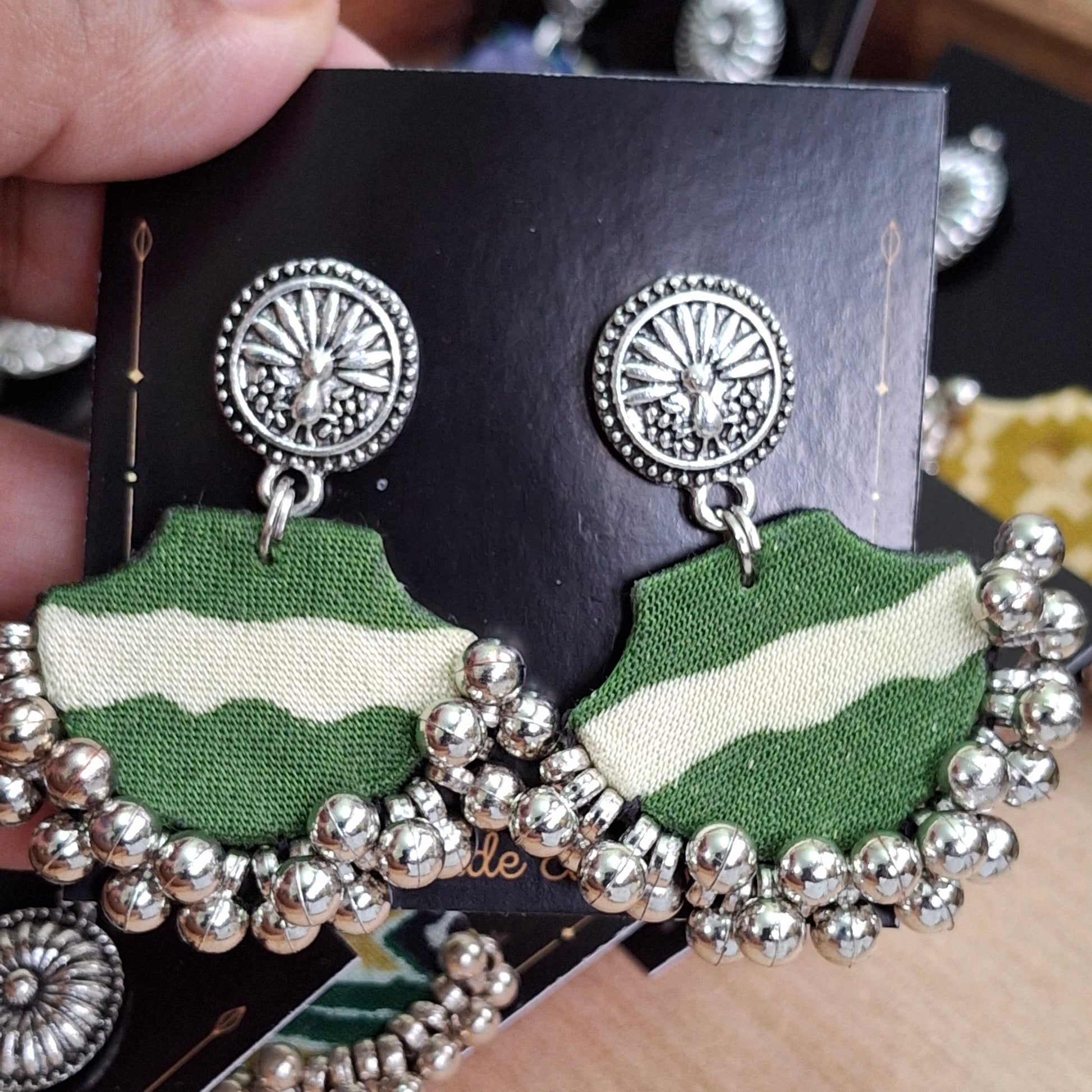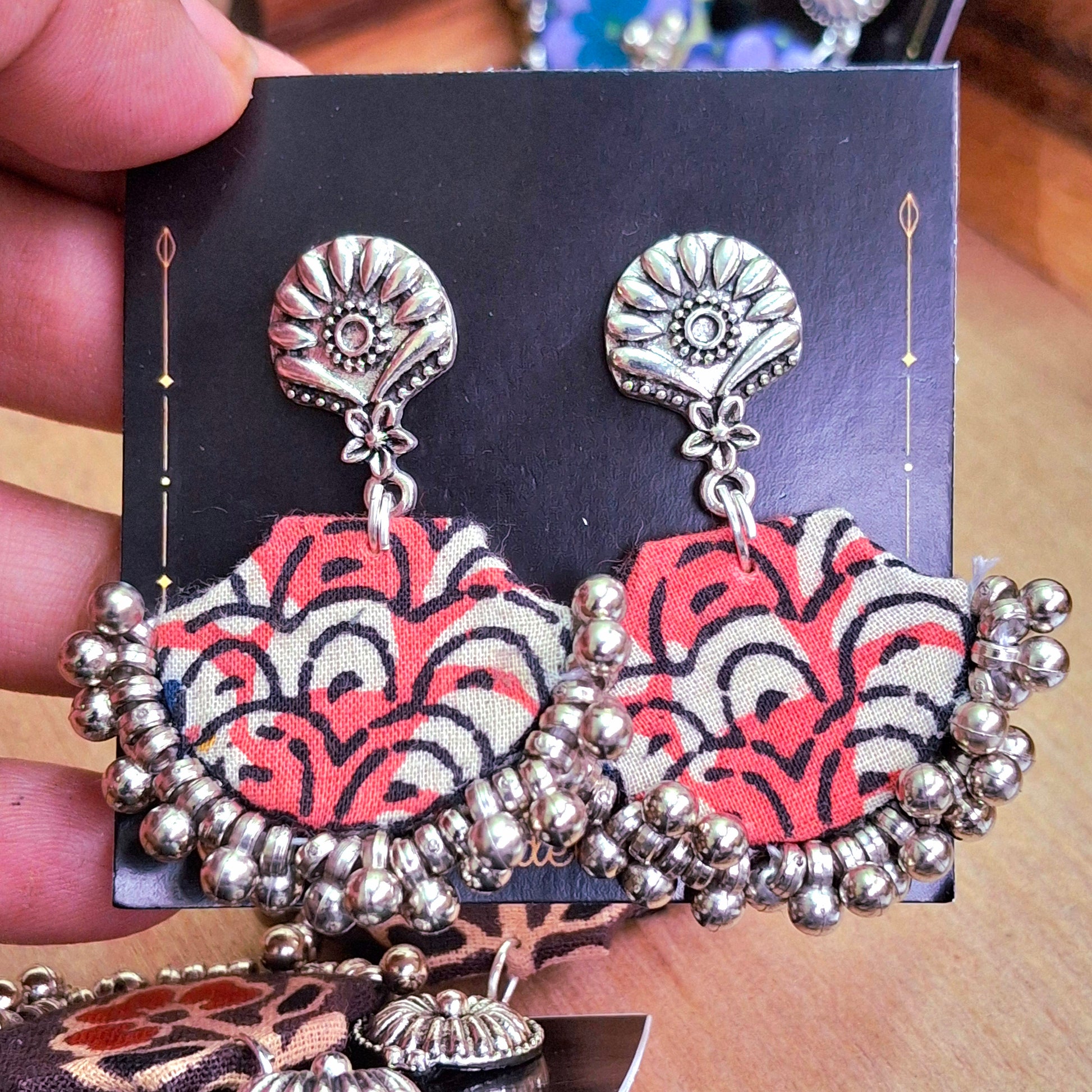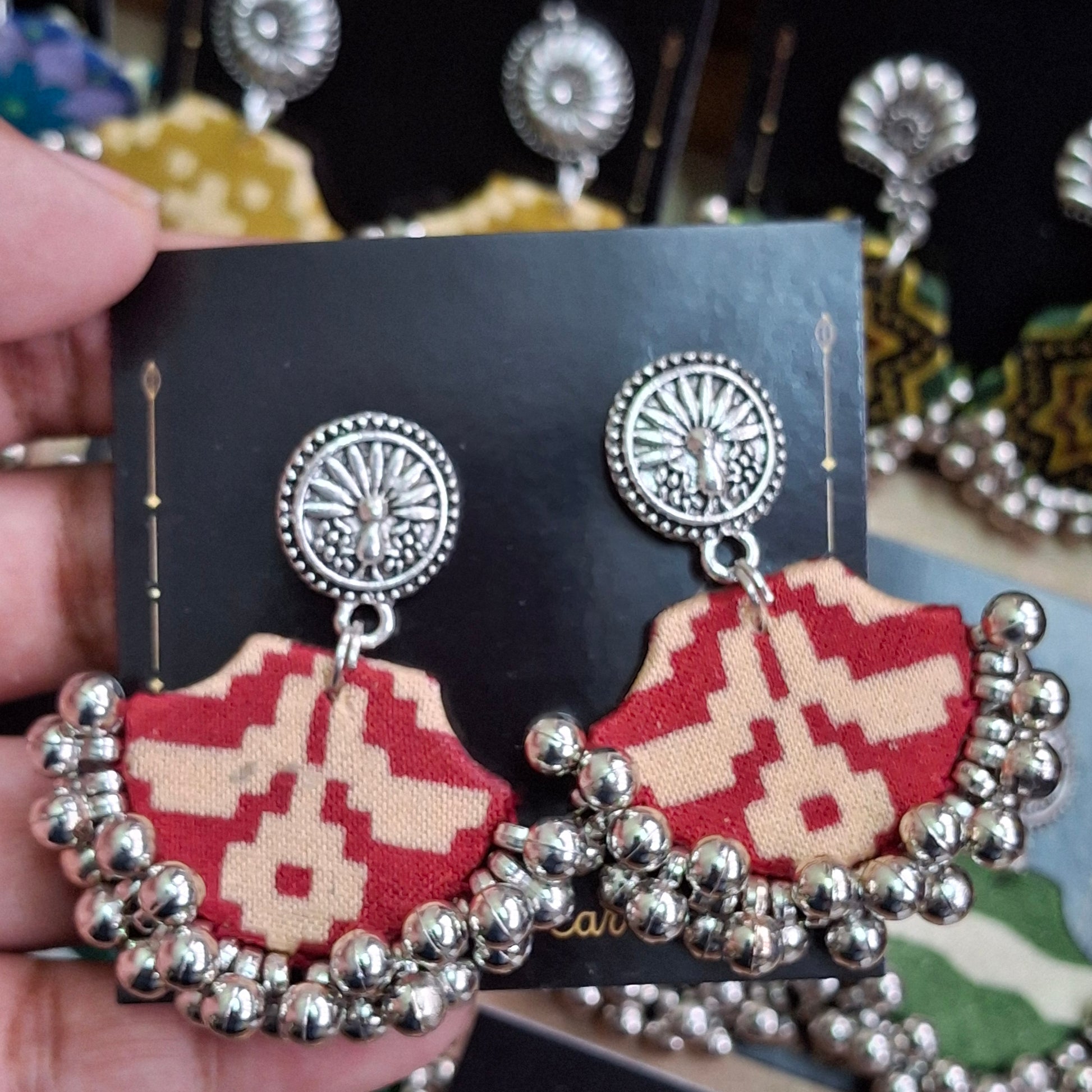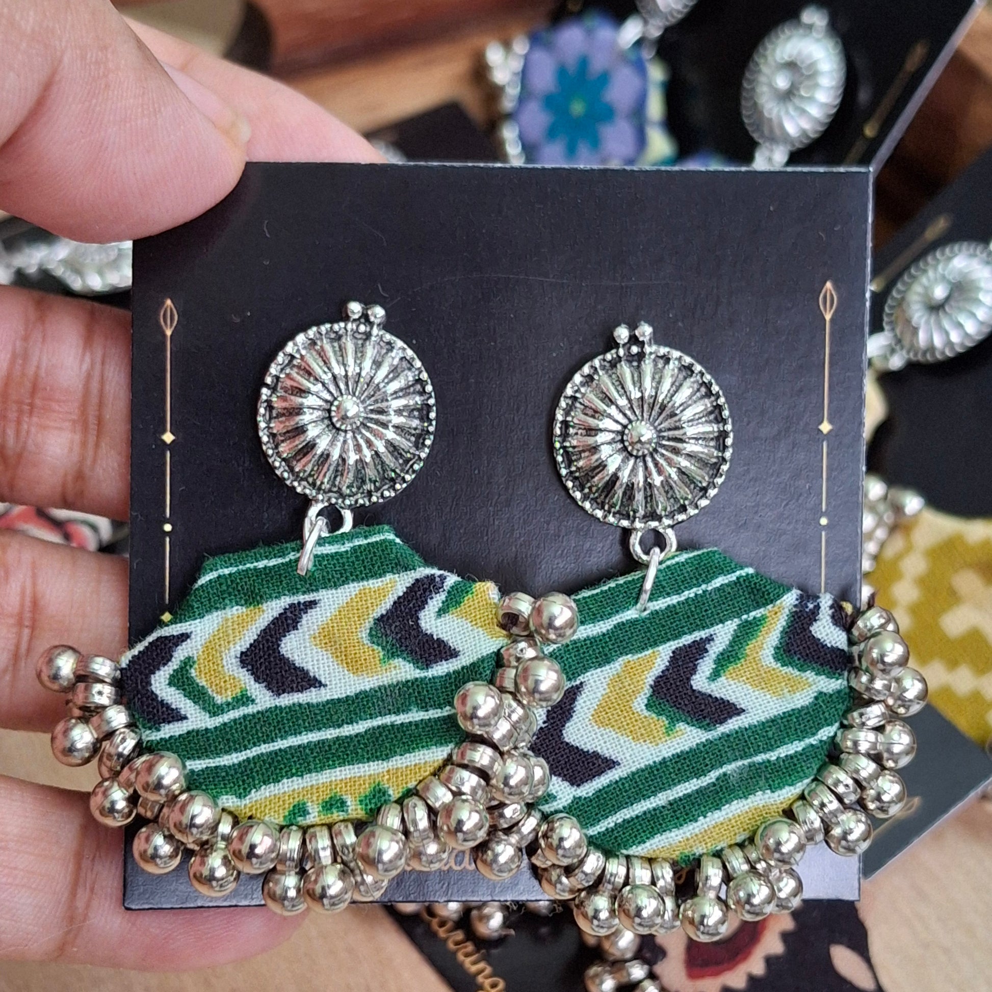 When you want to style but not heavy, these light fabric earrings are perfect. You can style these with our Ajrakh Mashru Silk Tote Bags to complete the look.