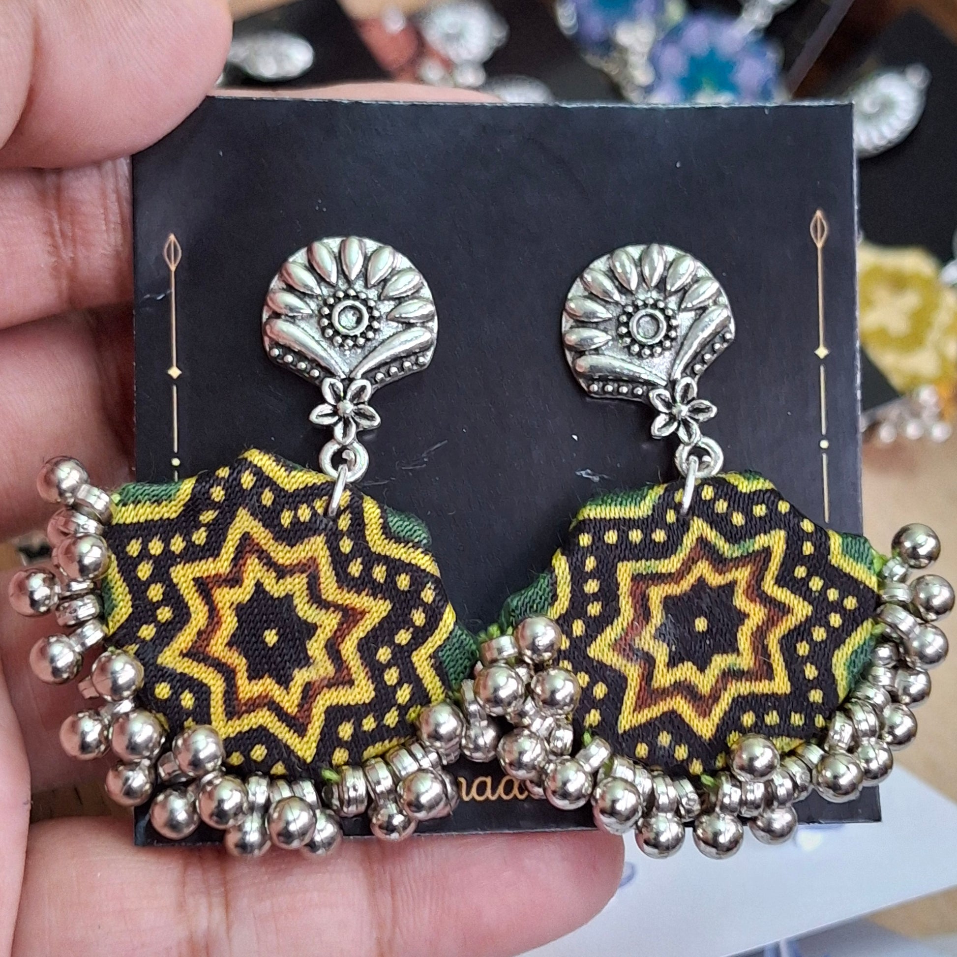 Size- 2inches*1.5inches, 25gms, Lightweight fabric earring allows you to accentuate your features with your favourite color. It has a sturdy rubber backing making it durable. Small silver coloured oxidised metal ghunghroos & shapes enhance the look of the earrings.