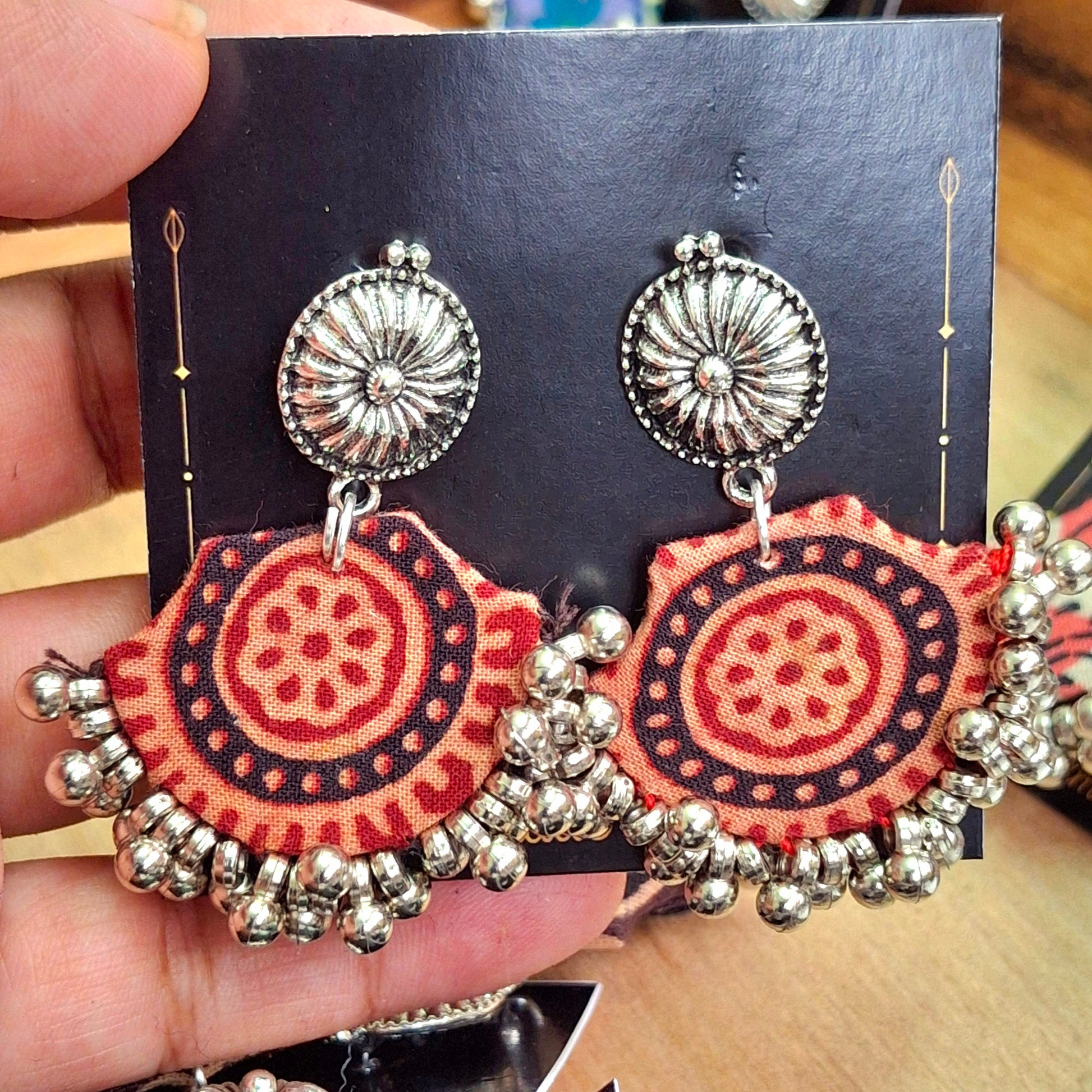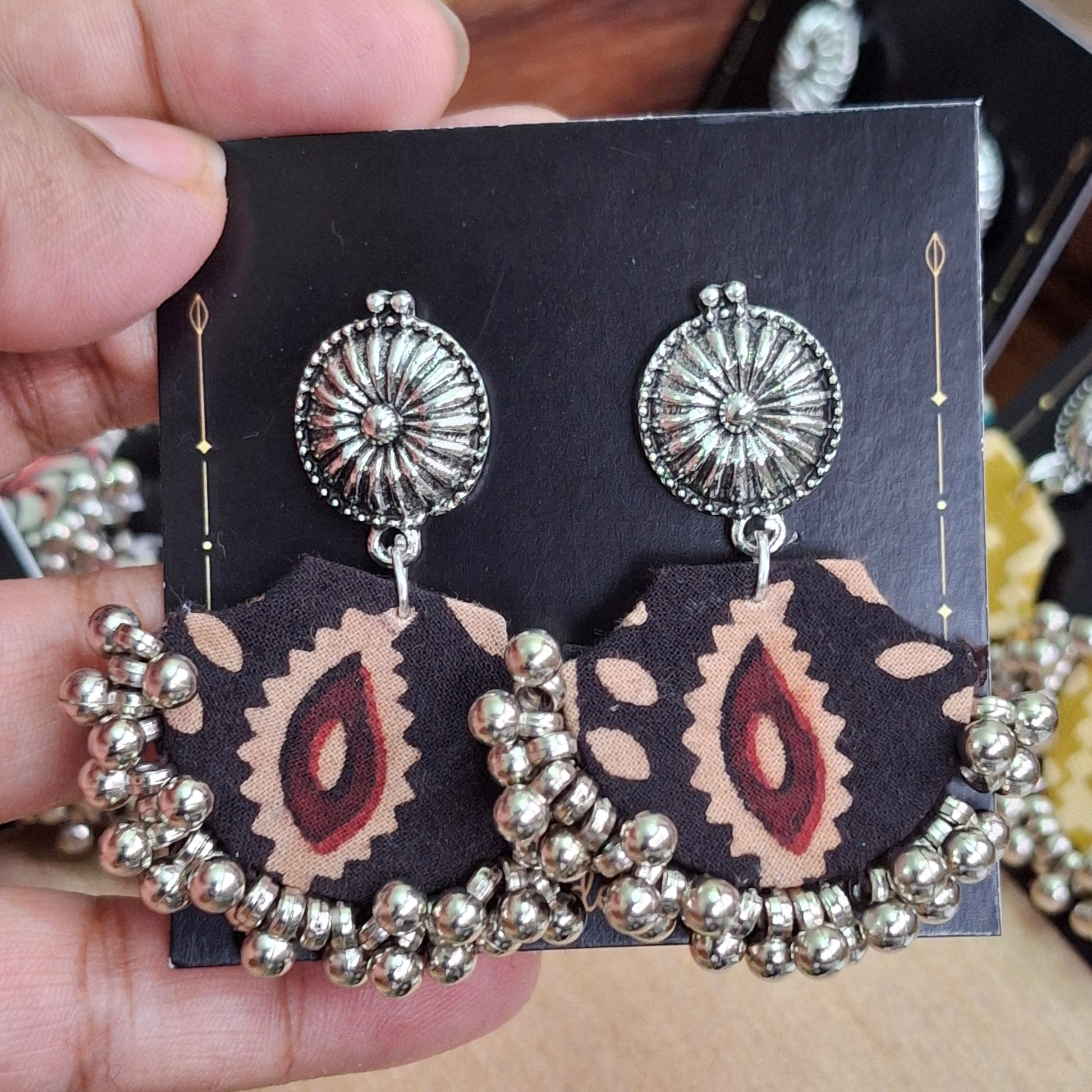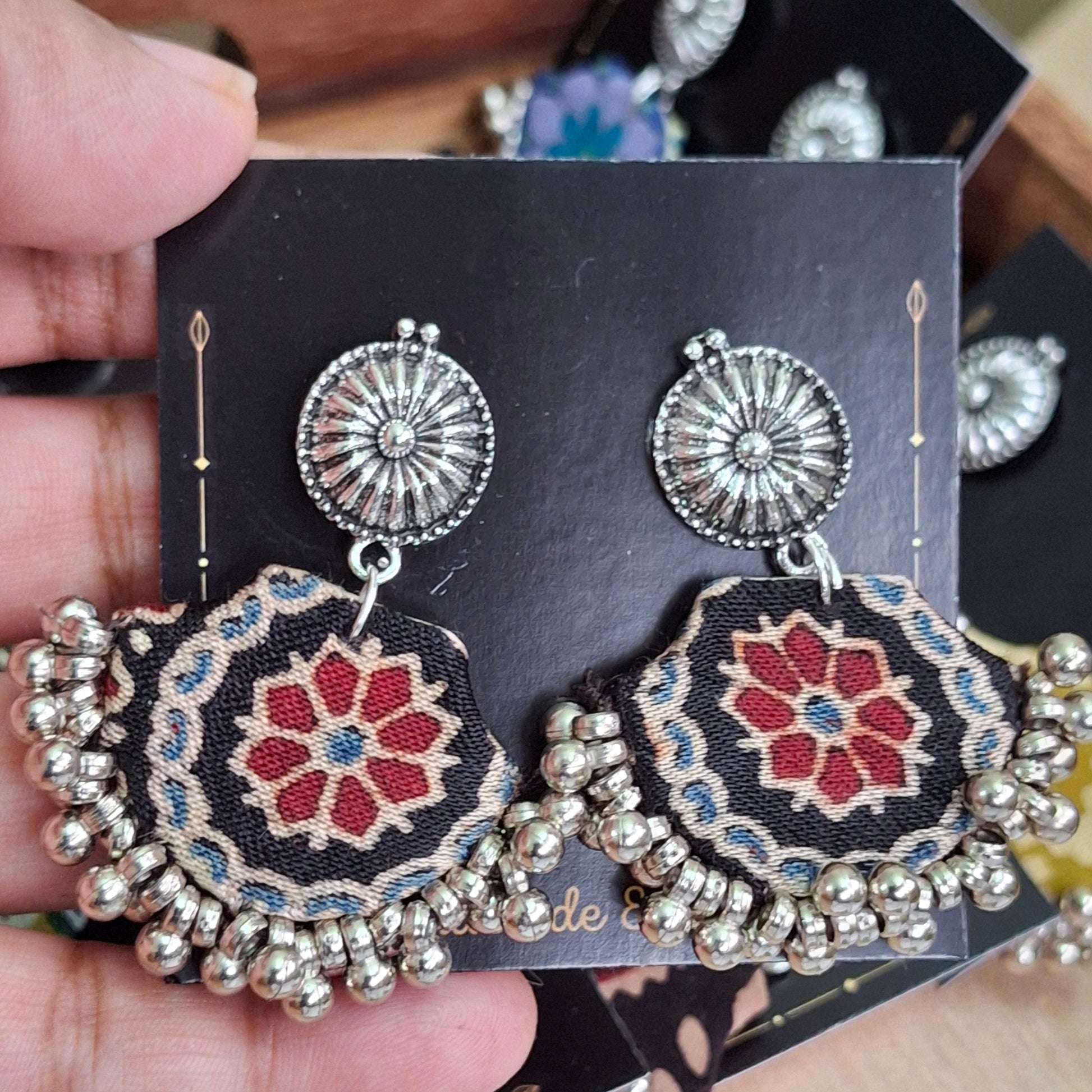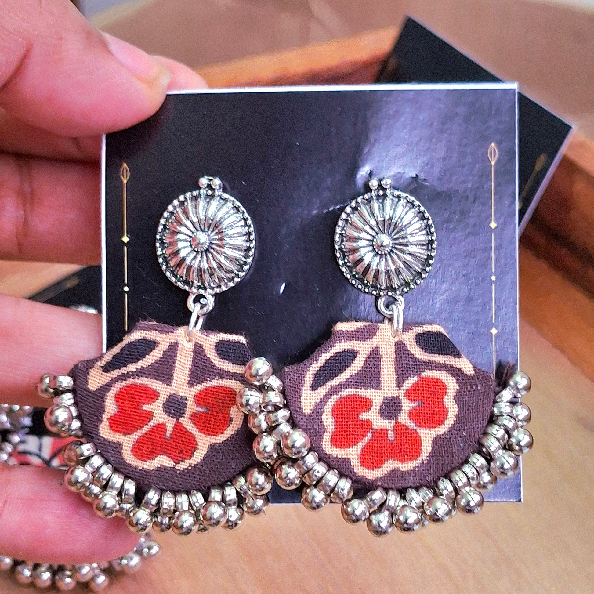 Mahi earrings are chaandbali type earrings, handcrafted with shiny mashru silk fabric that gives a soft feel with elegant look. It is dyed with natural dyes to give birth to beautiful block printed Ajrakh motif & ย pattern. It is a blend of style with functionality, handcrafted by the artisans of Gujarat who, with their craftsmanship offer us a glimpse of their heritage.