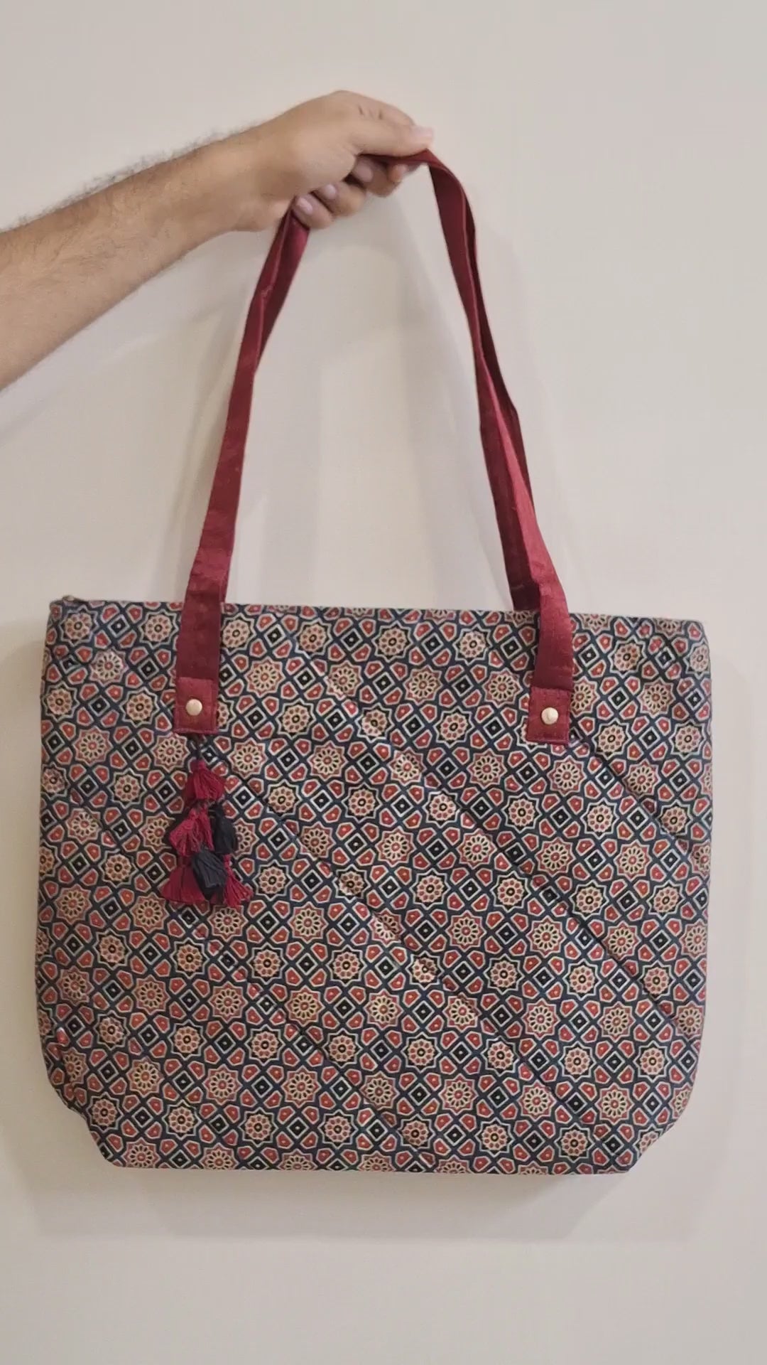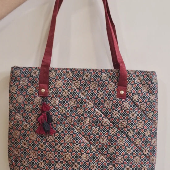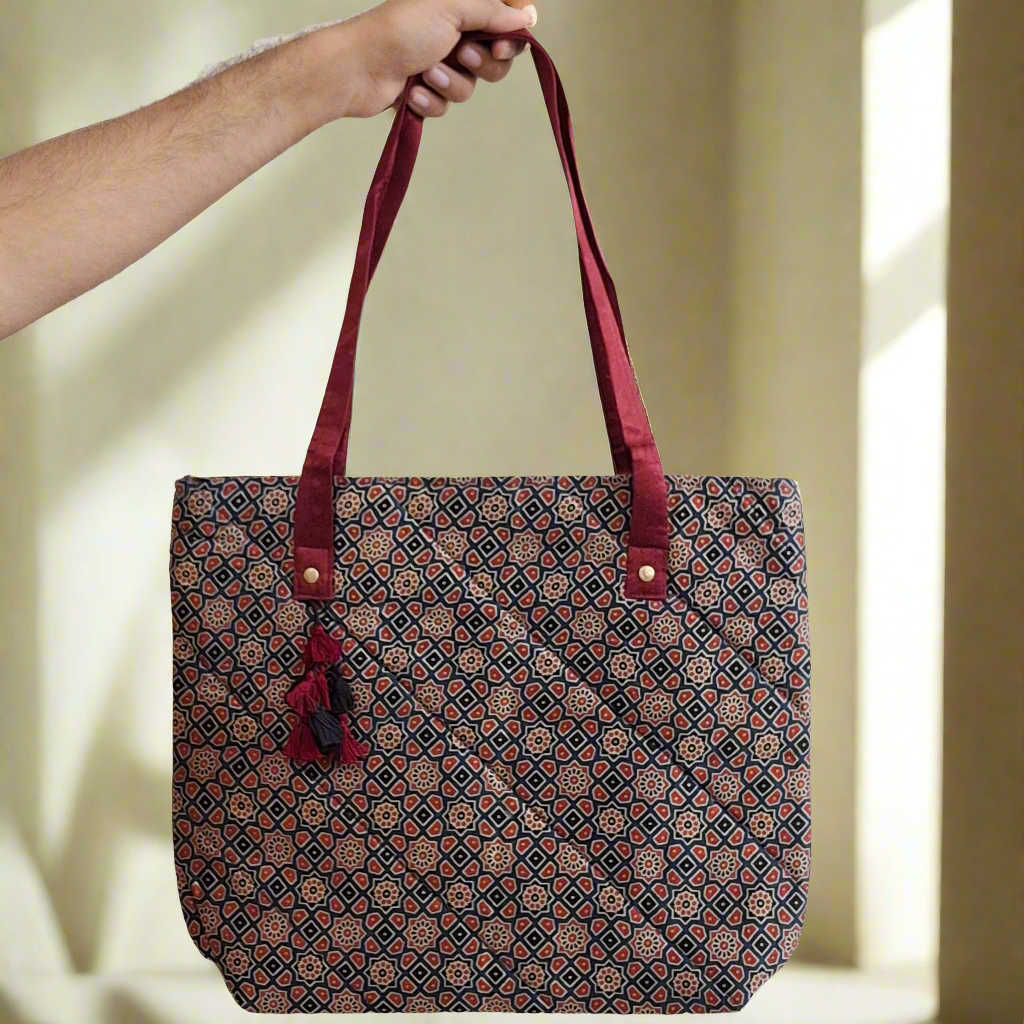 This Tote bag is handcrafted with shiny mashru silk fabric, a soft padding and black & red tassels that give a soft feel with elegant look. It is dyed with natural dyes to give birth to beautiful block printed Ajrakh motifs & patterns. It is a blend of style with functionality. It is handcrafted by the artisans of Gujarat who, with their craftsmanship offer us a glimpse of their heritage.