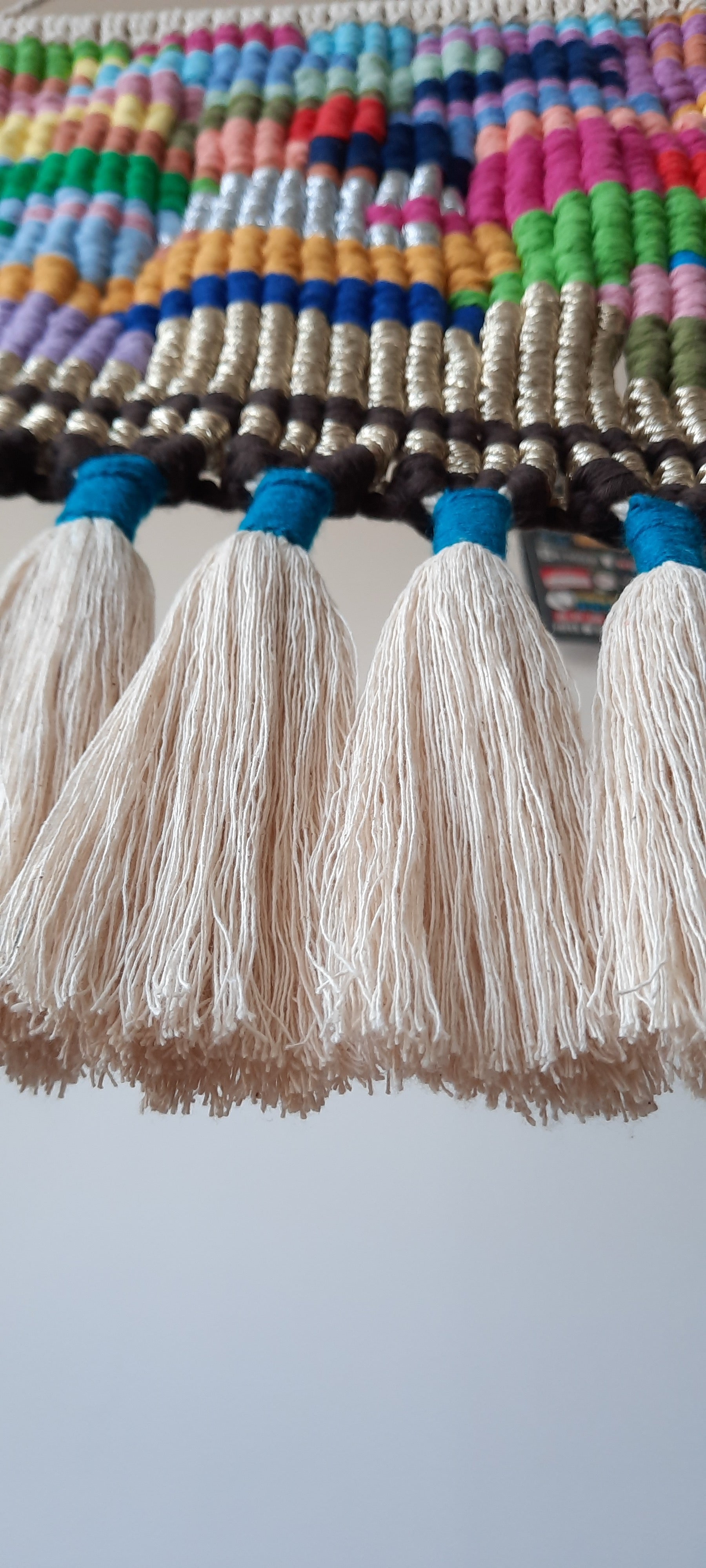 This piece is an overall representation of bright and vivid colours in a party including the glimmer and shimmer shown by silver and golden cords. This is concluded with brown, symbolic of the end of the party. The blue in the fringes is to extend the ecstatic as well as cool free flowing party vibe. It is an ironic piece that lets the colours flow but also sees a closure and control with the end part of the tapestry. Safe to say, it is a representation of balance.