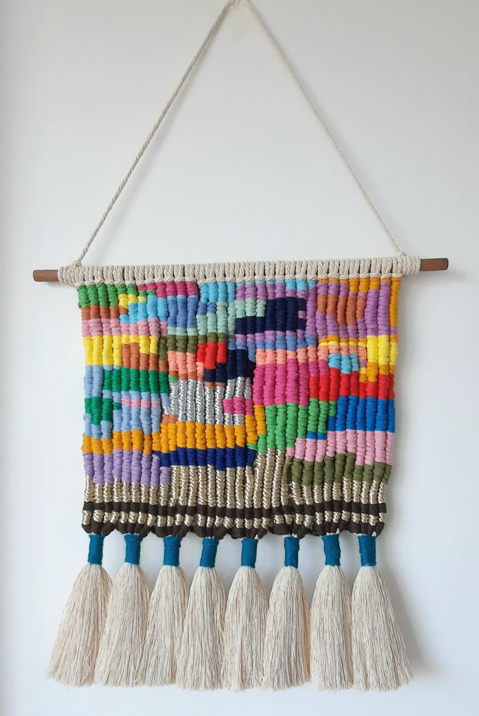 It showcases the intricate 3mm -4 mm cotton and cotton poly blend, single stranded, recycled cords, brought together with almost 2080 knots to create the pixel picture. The tapestry is hung on a wooden pinewood dowel using 32 × 4mm twisted natural cotton cords with larks head knots. The piece is finished with 8 stylish chunky fringes, held by turquoise wool yarn.